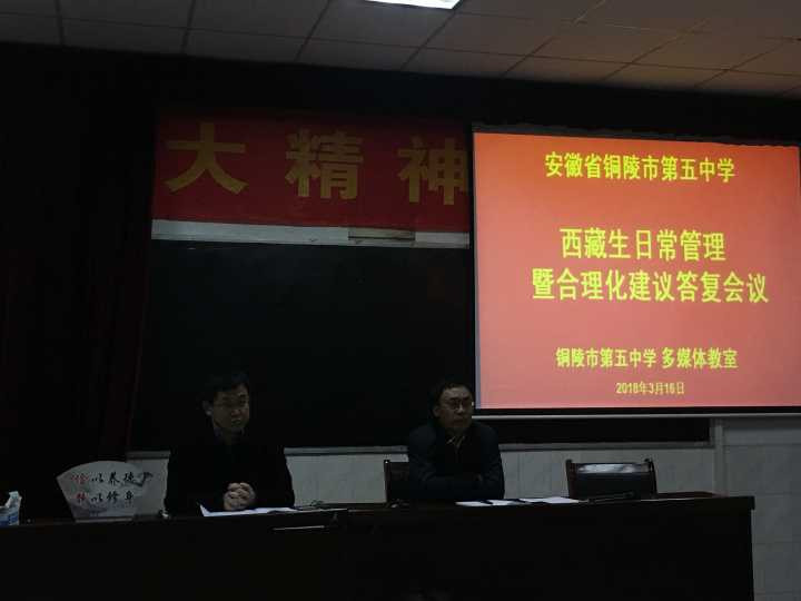 會(huì)上,吳成兵老師首先提出本學(xué)期以來西藏生日常管理一些問題,并就這次在全體西藏生中間合理化建議征集情況做了簡(jiǎn)單的介紹。之后,沐揚(yáng)校長(zhǎng)就西藏生提出的歸納成的12條建議逐一進(jìn)行答復(fù):有的現(xiàn)場(chǎng)解決,有的正在協(xié)調(diào)解決,有的爭(zhēng)取創(chuàng)造條件早日解決,暫時(shí)不能解決的問題也給學(xué)生一一回應(yīng)。接著,沐校長(zhǎng)就周六補(bǔ)缺補(bǔ)差調(diào)整、西藏生的“三四五工程”、自主管理、春季衛(wèi)生習(xí)慣養(yǎng)成等問題提出明確的要求。最后,吳成兵老師還就西藏生日常生活、文化課學(xué)習(xí)、研學(xué)活動(dòng)等與參會(huì)的西藏生做了深入的交流。