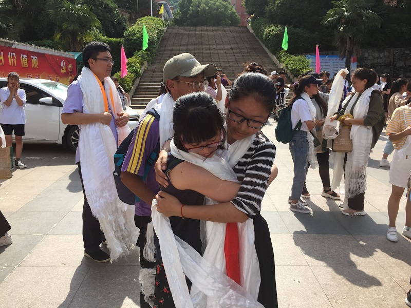 學(xué)校領(lǐng)導(dǎo)、高三班主任和前來送行的同學(xué)們?cè)缫训群蛟趯W(xué)校大門口,“注意安全!”“保持聯(lián)系!”“�;丶铱纯矗 贝蠹蚁嗷ザ谥�,平靜的話語中流露出依依不舍。藏班畢業(yè)生們恭敬地為班主任和老師們獻(xiàn)上潔白的哈達(dá),感謝他們?nèi)甑年P(guān)心和照顧。大家不停地握手,不停地?fù)肀В瑓s不愿多說一句,因?yàn)樵捯怀隹诰蜁?huì)變成哽咽的呢喃。當(dāng)車門關(guān)閉,大家揮舞手臂道出最后一句“珍重”時(shí),淚水也已掛滿臉頰。在藏班畢業(yè)生們的心中,此刻的感受就和三年前他們離開故鄉(xiāng)西藏時(shí)的感受相同。而這樣的離別也讓五中的師生懂得了緣分的寶貴和珍惜的真諦。