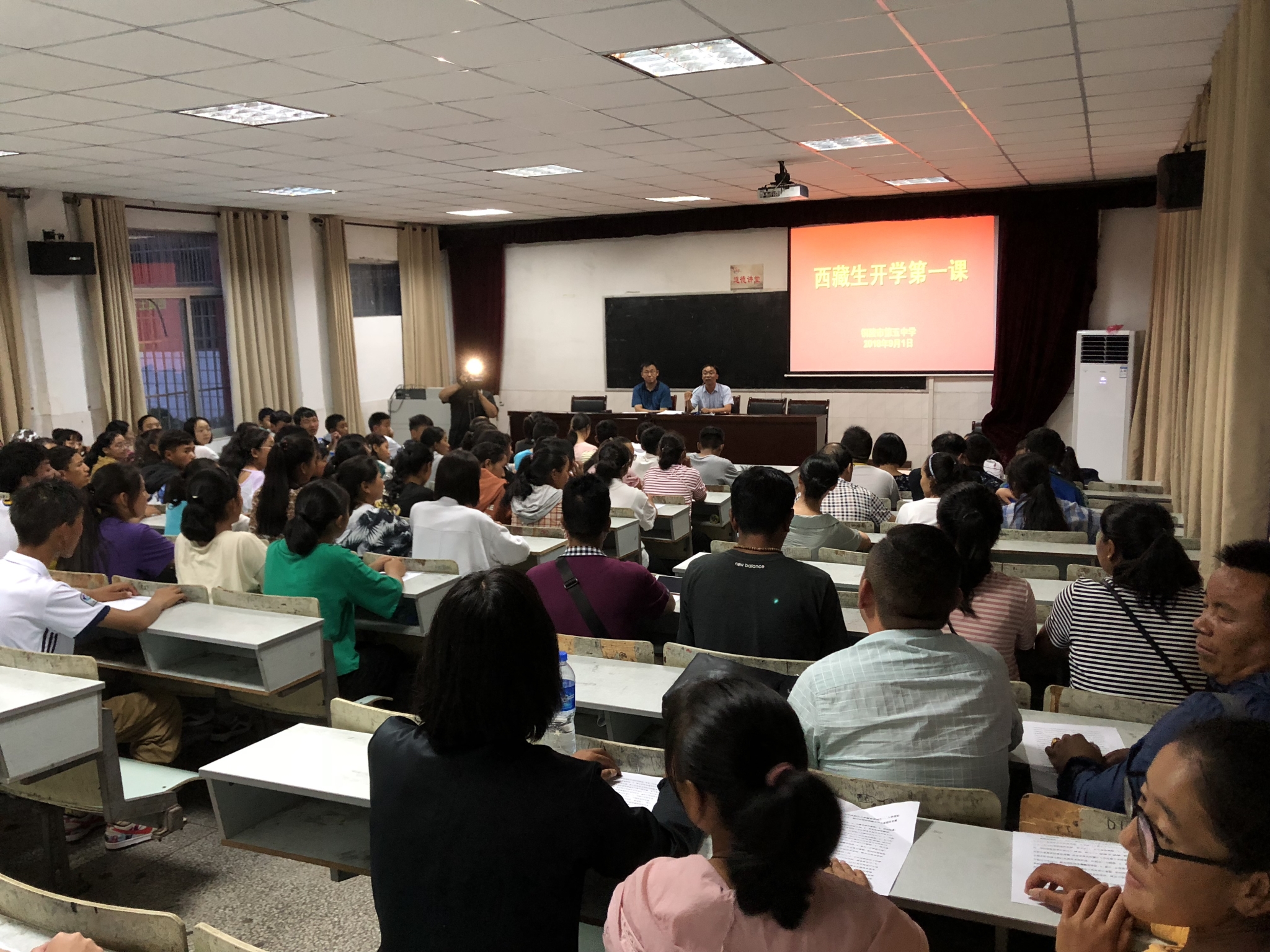 為了能讓西藏新生更好更快的適應(yīng)新的校園環(huán)境,9月1日晚我校組織高一山南班和散插班新生在校階梯教室,集中開展“西藏生開學(xué)第一課---民族團結(jié)專題”教育活動。高三藏生代表韓珂同學(xué)回顧了在五中學(xué)習(xí)的點點滴滴和收獲,高一年級組組長蔣靈慧老師發(fā)言向新生表示歡迎,隨后校藏生工作處吳成兵主任詳細介紹了藏生的相關(guān)管理規(guī)定,最后,沐揚校長介紹了學(xué)校的概況,并重申了校規(guī)校紀,提出了對藏生的殷切期望,希望他們能盡快適應(yīng)學(xué)習(xí)環(huán)境,處理好師生、同學(xué)之間的關(guān)系,努力學(xué)習(xí)文化知識,成人成才。高一年級全體班主任、藏語老師、部分學(xué)生家長參加了此次教育活動。
