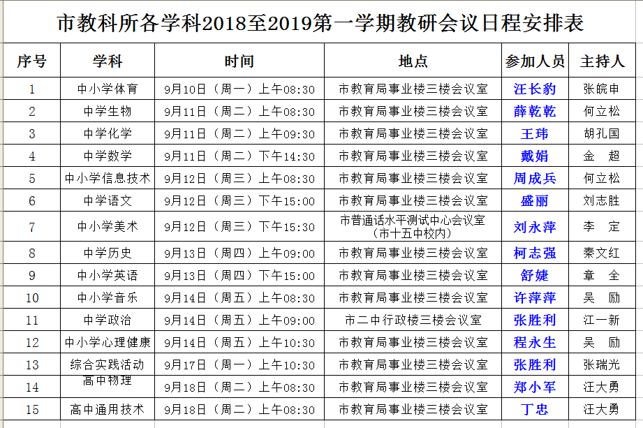 根據(jù)市教科所銅教研函〔2018〕89號精神,決定于9月10日至14日期間召開全市各學(xué)科秋季教研工作會議,請我校各教研組長和相關(guān)教師準時參加,并及時向本學(xué)科教師傳達會議精神。會議具體安排如下: