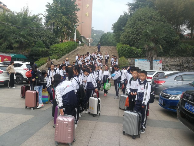 拉著行李箱,邁著輕快的腳步,同學(xué)們?cè)诶蠋煹挠行虬才畔拢谛@門口集合,揮別擔(dān)心的父母,乘上學(xué)校提前安排的大巴車前往綜合實(shí)踐基地。