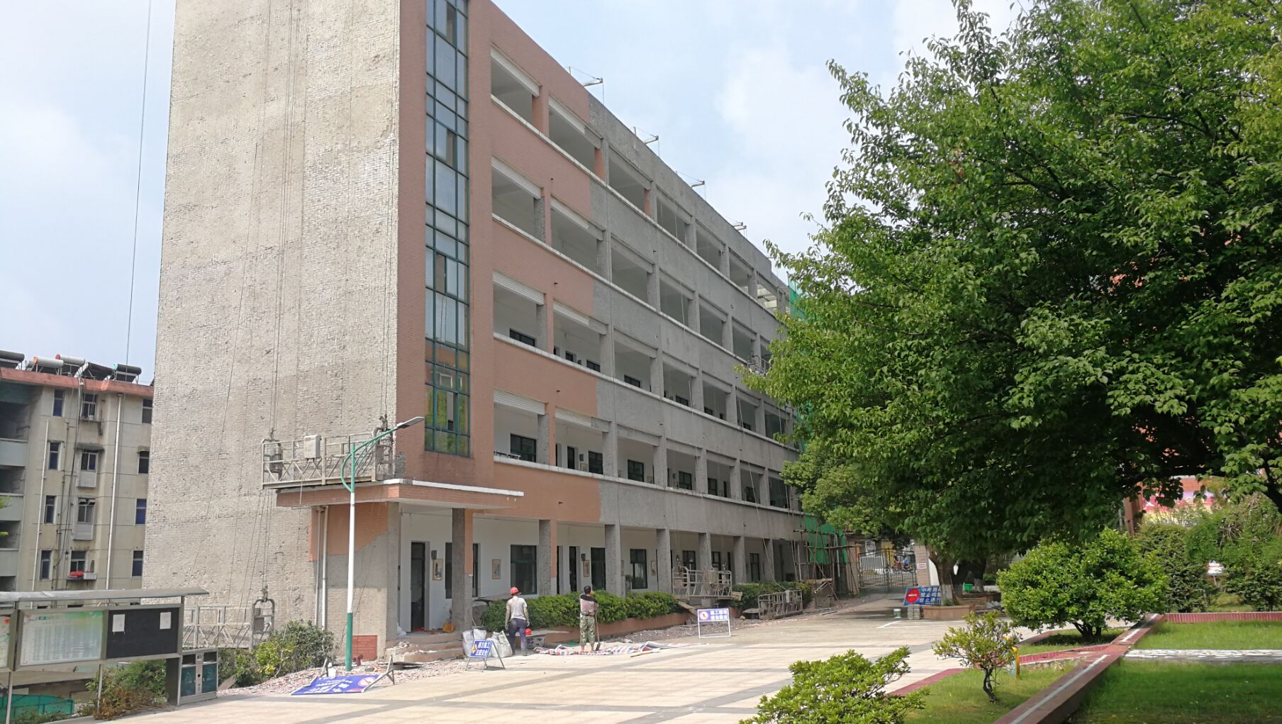 暑假已經(jīng)開始一周多了,此時走進沒有學(xué)生銅陵五中大門,校園顯得格外的整潔、寧靜。穿過大門后的小廣場,拾階而上,43級臺階之后,突然映入眼簾的卻是一派繁忙的景象:教學(xué)圖書樓、科學(xué)館的外墻已基本鏟除,工人師傅人井然有序的忙碌其中……