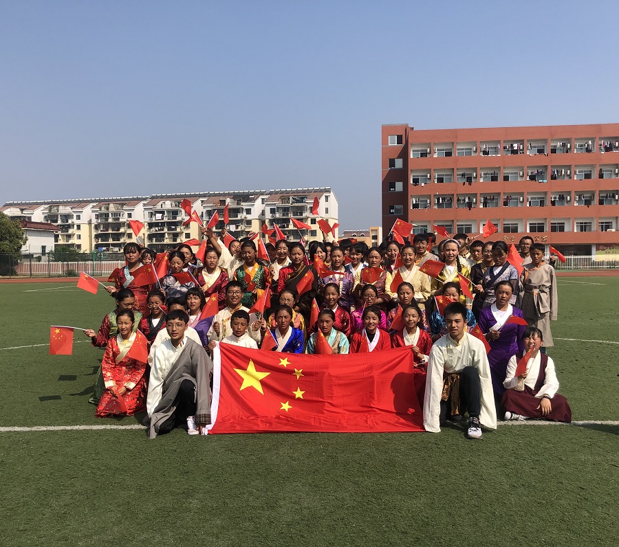 西藏生們穿著民族服裝,在學(xué)校操場(chǎng)唱著《我和我的祖國(guó)》,揮舞手中的小紅旗,表達(dá)著對(duì)祖國(guó)最深的祝福!