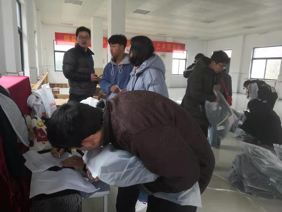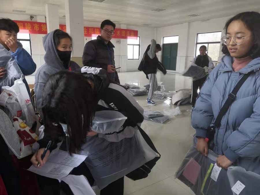 同學(xué)們秩序井然的領(lǐng)取自己的冬裝。