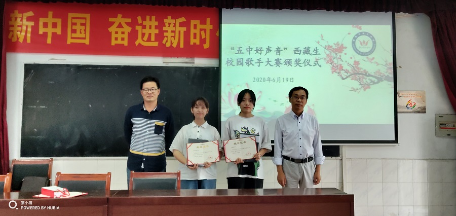 為了進一步豐富我校西藏生的校園文化生活,營造積極向上、格調(diào)高雅、健康文明的校園文化氛圍,展示我校西藏生多才多藝、團結(jié)創(chuàng)新、銳意進取、蓬勃向上的精神風貌,讓歌聲見證青春成長,用旋律為夢想起航。近日,我校西藏生工作處特主辦“五中好聲音”西藏生校園歌手大賽。經(jīng)過兩個星期的層層選拔比賽,選手們懷揣著激情與夢想,用他們美妙的歌聲感染著觀眾們的心靈。經(jīng)過激烈角逐后,高二(4)班拉珍等同學獲得本次比賽的獎項。6月19日下午,西藏生工作處全體老師出席頒獎儀式,為獲獎同學們送上證書及獎品。并鼓勵他們再接再厲,培養(yǎng)興趣愛好,豐富學習生活。