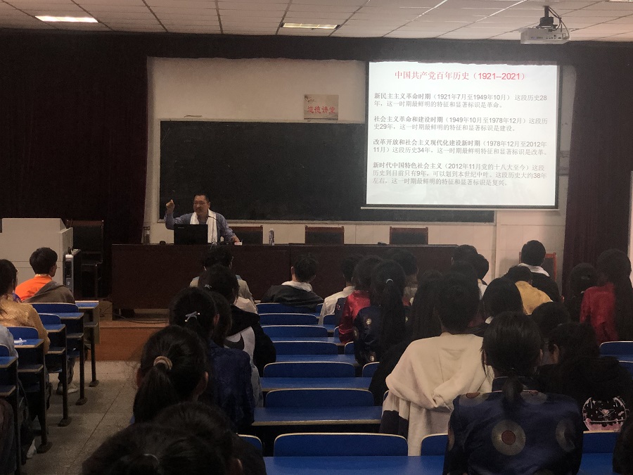 邵軍教授首先強(qiáng)調(diào)了現(xiàn)如今開(kāi)展黨史學(xué)習(xí)教育的必要性,尤其是作為西藏班的學(xué)生,是更要知黨史、感黨恩,讓紅色基因、革命薪火代代傳承。他用激情澎湃的語(yǔ)言帶領(lǐng)藏族班的孩子們一起重溫黨的百年光輝歷程,從中共一大的一艘紅船講到改革開(kāi)放的小崗村,從最初黨的13名黨員發(fā)展到如今奮斗在各戰(zhàn)線的全國(guó)9000多萬(wàn)黨員。讓孩子們明白,成功是奮斗出來(lái)的,中華民族的偉大復(fù)興征程也是中國(guó)共產(chǎn)黨領(lǐng)導(dǎo)下全體中國(guó)人民共同努力奮斗的結(jié)果。邵教授精彩的講述征服了在場(chǎng)的全體漢藏師生,現(xiàn)場(chǎng)掌聲此起彼伏,孩子們熱烈的討論著,紛紛訴說(shuō)著自己家鄉(xiāng)在黨的脫貧攻堅(jiān)政策指引之下翻天覆地的變化。西藏生們更加自覺(jué)堅(jiān)定的感黨恩,聽(tīng)黨話,跟黨走,努力學(xué)習(xí),為建設(shè)美麗西藏,為中華民族偉大復(fù)興貢獻(xiàn)自己的力量。