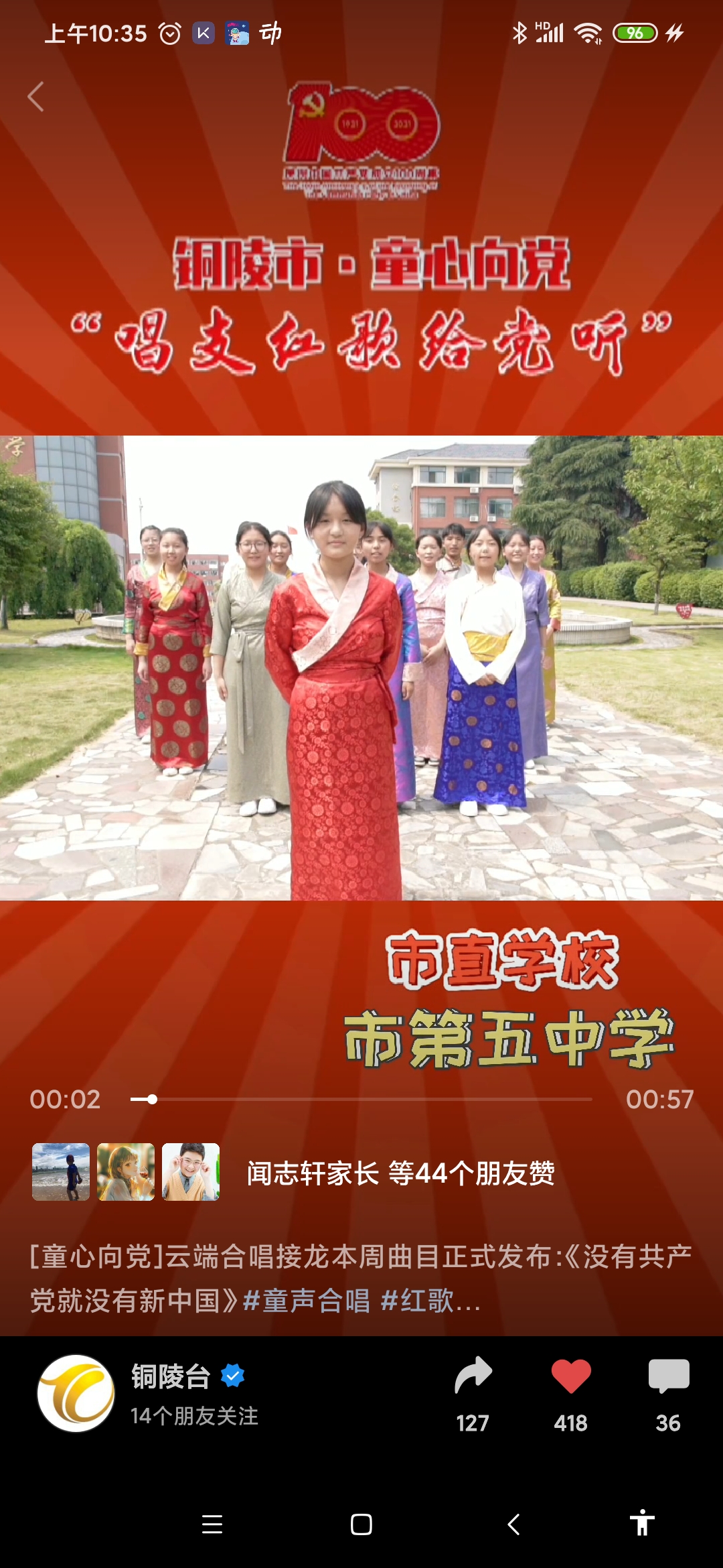 為慶祝中國共產(chǎn)黨成立100周年,激發(fā)全體市民的愛黨愛國情懷,銅陵臺舉辦了以"童心向黨·唱支紅歌給黨聽"為主題的云端合唱接龍活動。市五中西藏班學(xué)生合唱的《沒有共產(chǎn)黨就沒有新中國》被推選為欣賞曲目。