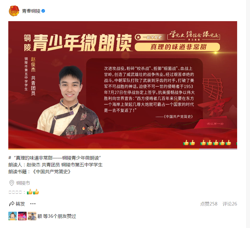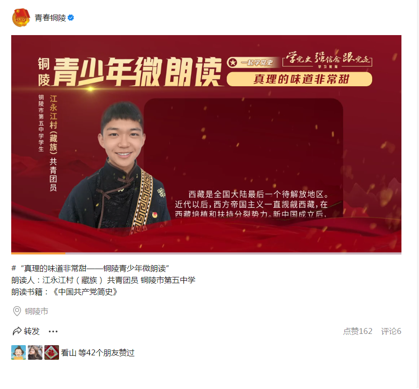 近日,經(jīng)過層層選拔,市五中江永江村、趙俊杰、德吉曲珍被推選參加“真理的味道非常甜——銅陵青少年微朗讀”線上展示活動。