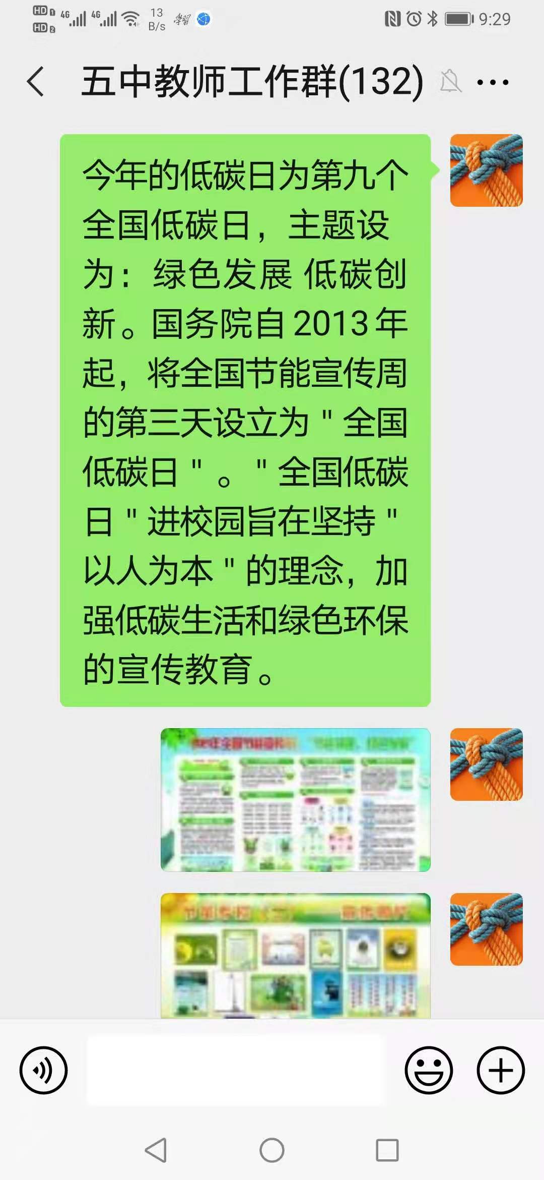根據(jù)學校統(tǒng)一部署,總務處具體安排并落實“全國節(jié)能宣傳周暨低碳日”宣傳活動,通過晨會倡議,橫幅標語、宣傳欄展示、教師微信群等方式來引領校園節(jié)能風尚,引領師生踐行低碳理念。