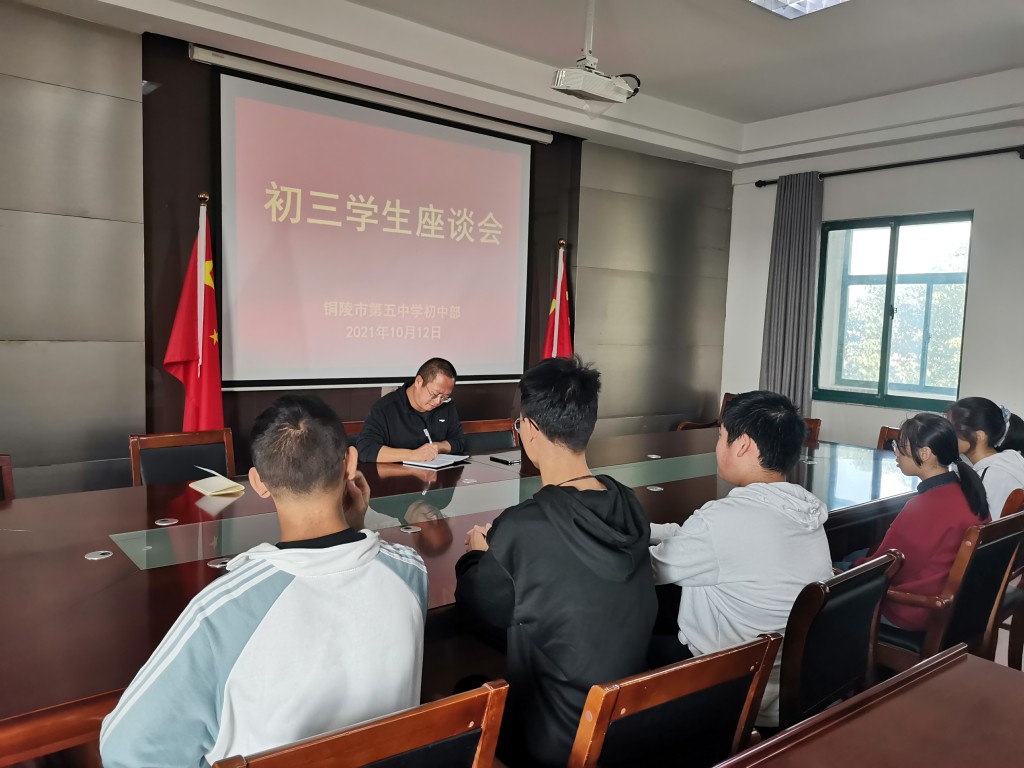 10月12日上午,市五中初中級部在綜合樓召開初三學生座談會。會議由初中部部長瞿大寨主持,初三部分學生代表參加會議。