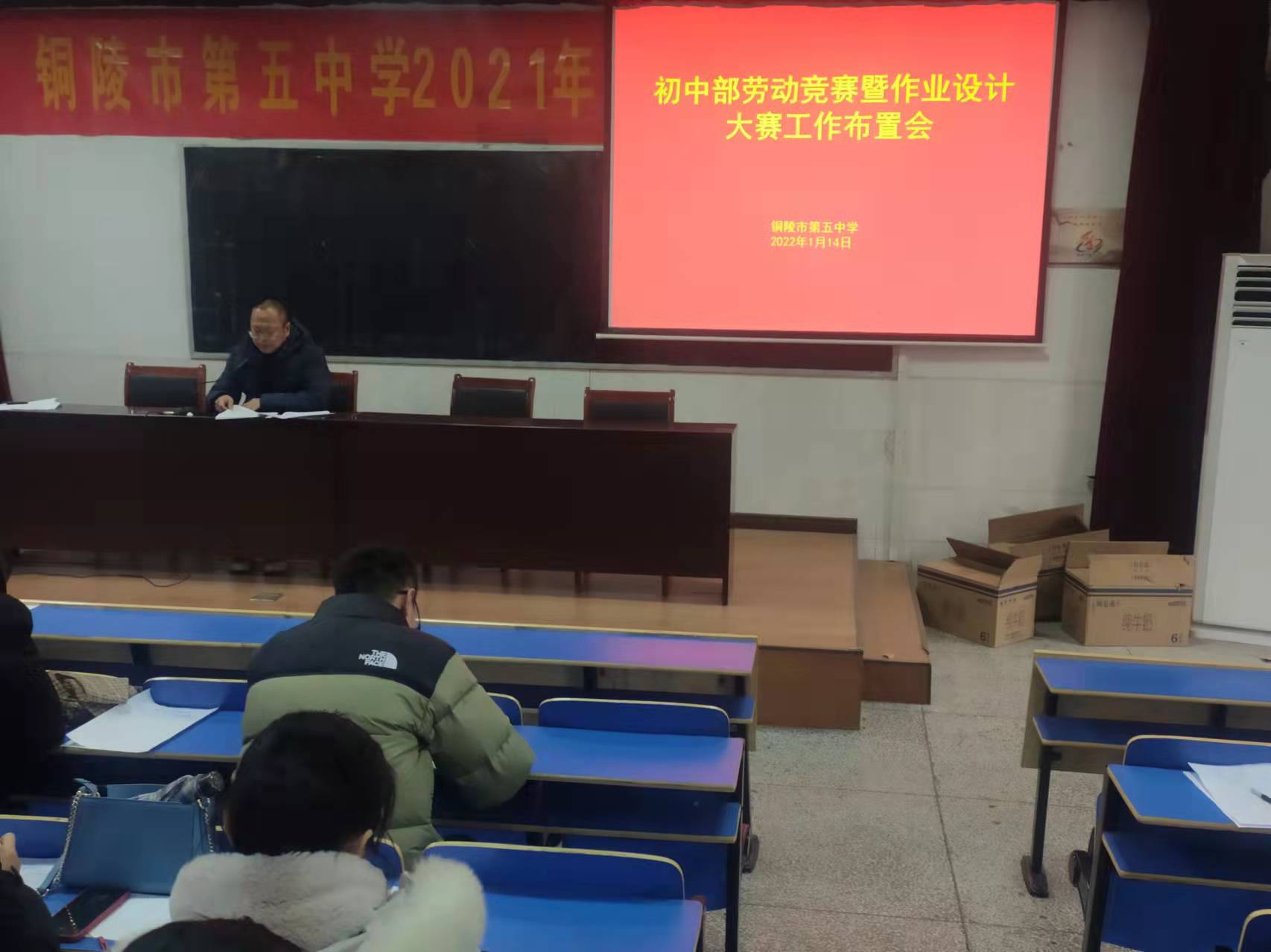 1月14日下午,市五中初中部召開勞動競賽暨作業(yè)設(shè)計(jì)大賽工作布置會,初中部中心組成員和全體初中部教師參加會議。初中部部長瞿大寨主持會議。