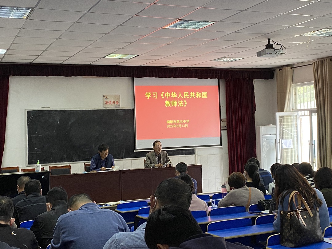 5月13日下午,銅陵市第五中學(xué)組織全體教師再次學(xué)習(xí)《中華人民共和國(guó)教師法》,強(qiáng)化廣大教職工法治意識(shí),嚴(yán)守廉潔從教思想。學(xué)法活動(dòng)前,學(xué)校給每一位教職工發(fā)放了一本匯編版的《中華人民共和國(guó)教育法》、《中華人民共和國(guó)義務(wù)教育法》、《中華人民共和國(guó)教師法》法律文本。學(xué)校業(yè)務(wù)副校長(zhǎng)呂建國(guó)帶領(lǐng)全體教職工學(xué)習(xí)了《中華人民共和國(guó)教師法》。呂校長(zhǎng)向全體教師重點(diǎn)解讀了“教師的權(quán)利與義務(wù)”、“法律責(zé)任”等章節(jié),強(qiáng)調(diào)廣大教師要遵守法紀(jì),嚴(yán)于自律,提升師德,廉潔從教。并結(jié)合教育部關(guān)于《中華人民共和國(guó)教師法(修訂草案)(征求意見稿)》向老師們解讀了新時(shí)代條件下,法律對(duì)教師的資格和準(zhǔn)入、聘任和考核等方面相關(guān)規(guī)定的調(diào)整和變化。