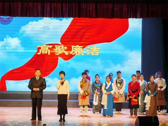 我校任娟、安濤、達娃扎西三位老師的優(yōu)秀作品《高歌清廉》作為壓軸節(jié)目在頒獎大會上進行展演,獲得全體觀眾的一致好評。