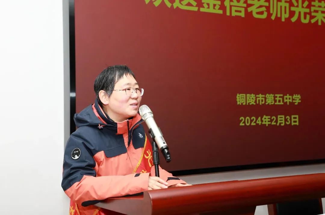 在全體教職工秋季學期結(jié)束會議上,金蓓老師的榮退感言發(fā)自肺腑,令人感動。首先她衷心感謝校領(lǐng)導(dǎo)的關(guān)懷,感謝同仁們?nèi)噍d的鼎力支持。然后她回顧自己的教學生涯,大學畢業(yè)后就在五中工作,一生獻給學校,只為銅五這片熱土,自己所帶的那一屆又一屆的學生。她的話語質(zhì)樸而深情,滿載著對學校的熱愛、感激、眷戀與不舍。最后她也對銅五輝煌的明天深信不疑,她堅信在上級部門的大力支持下,在銅五人的團結(jié)奮斗下,五中必將迎來更大的發(fā)展。