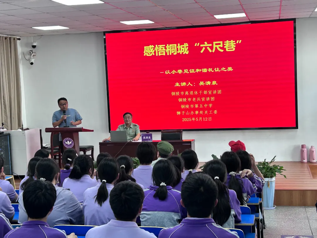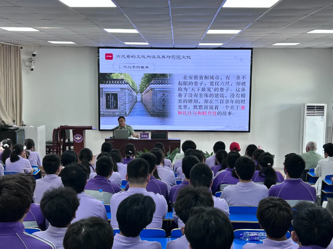 五月初夏,草木蔥蘢。為弘揚(yáng)中華優(yōu)秀傳統(tǒng)文化,培育青少年崇德向善的價(jià)值觀,5月12日上午,銅陵市第五中學(xué)的多功能廳內(nèi)洋溢著盎然春意與蓬勃朝氣,一場(chǎng)以“以小巷見證和諧禮讓之美”為主題的傳統(tǒng)文化講座在此舉行。市五老宣講團(tuán)團(tuán)長(zhǎng)、市委黨校退休教授吳清泉攜三百年前的禮讓佳話走進(jìn)校園,通過沉浸式歷史敘事與跨時(shí)空價(jià)值對(duì)話,為師生們開啟了一場(chǎng)“見精神、悟智慧、踐德行”的文化之旅。