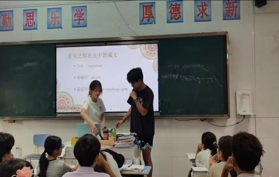 主題班會活動精彩紛呈。在“故事會”環(huán)節(jié),藏族學(xué)生熱情分享家族歷史與民族傳說,團隊成員精心記錄整理,并制作成圖文并茂的文化手冊分發(fā)給五中學(xué)生,有效增進了漢藏學(xué)生間的文化理解。“雙語互學(xué)”課堂氣氛活躍,團隊成員與藏族學(xué)生互教普通話與藏語,通過猜詞游戲、繞口令比賽等趣味形式,顯著提升了學(xué)生的語言交流能力,促進了文化相融。